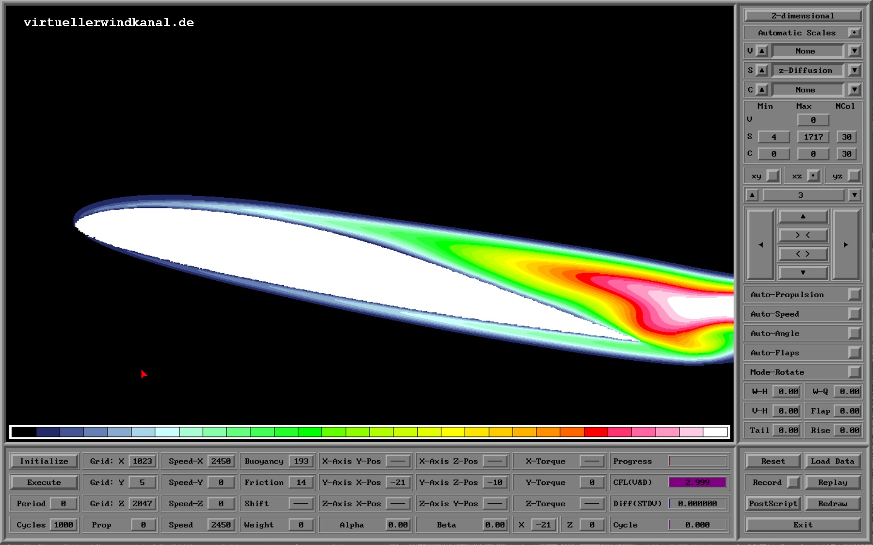 Analog zur Anströmung mit 0 Grad wird jetzt das Profil Eppler 374 mit 12 Grad angeströmt. Bild Epp12GVSPf zeigt für fast das gesamte, simulierte Gebiet die skalare Geschwindigkeit in Farbe, die Druckverteilung als Isolinien und die Geschwindigkeiten als Trajektorien. Da bei diesem Anstellwinkel eine stationäre Lösung wegen der Bildung auch größerer Wirbel nicht mehr mehr möglich war, habe ich durch eine Erhöhung der backward-Komponente im impliziten Zeitschrittverfahren die Strömung quasi durch eine Dämpfung in der Zeit zumindest im Bereich des Profils einigermaßen zu einem stationären Zustand gezwungen. Bild Epp12GVSP zeigt das Gebiet in höherer Auflösung.