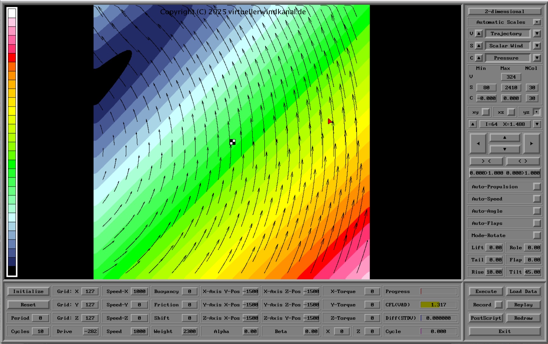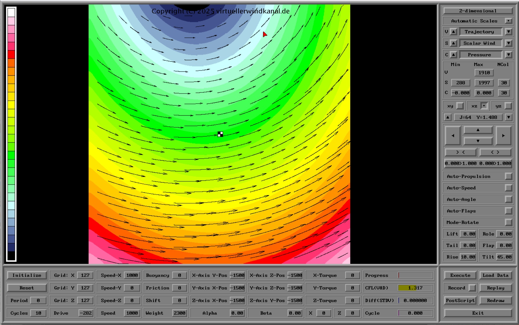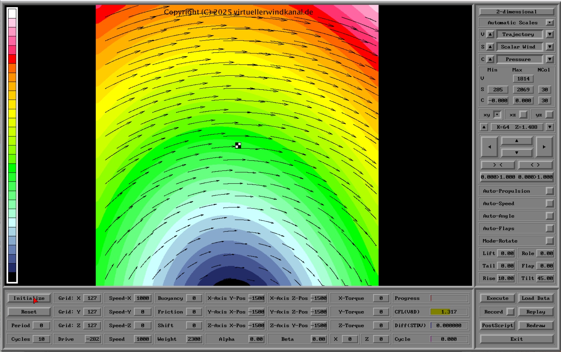 Dann wird das 3-dimensionale Geschwindigkeitsfeld für eine Referenzgeschwindigkeit von 10 m/s, einem Anstellwinkel von 10°, einem Neigungswinkel von 45° und einem Kurvenradius von 10m initialisiert und mit einer anfänglich verschwindenden Druckanomalie relativ zur hydrostatischen Grundgleichung das Modell gestartet.