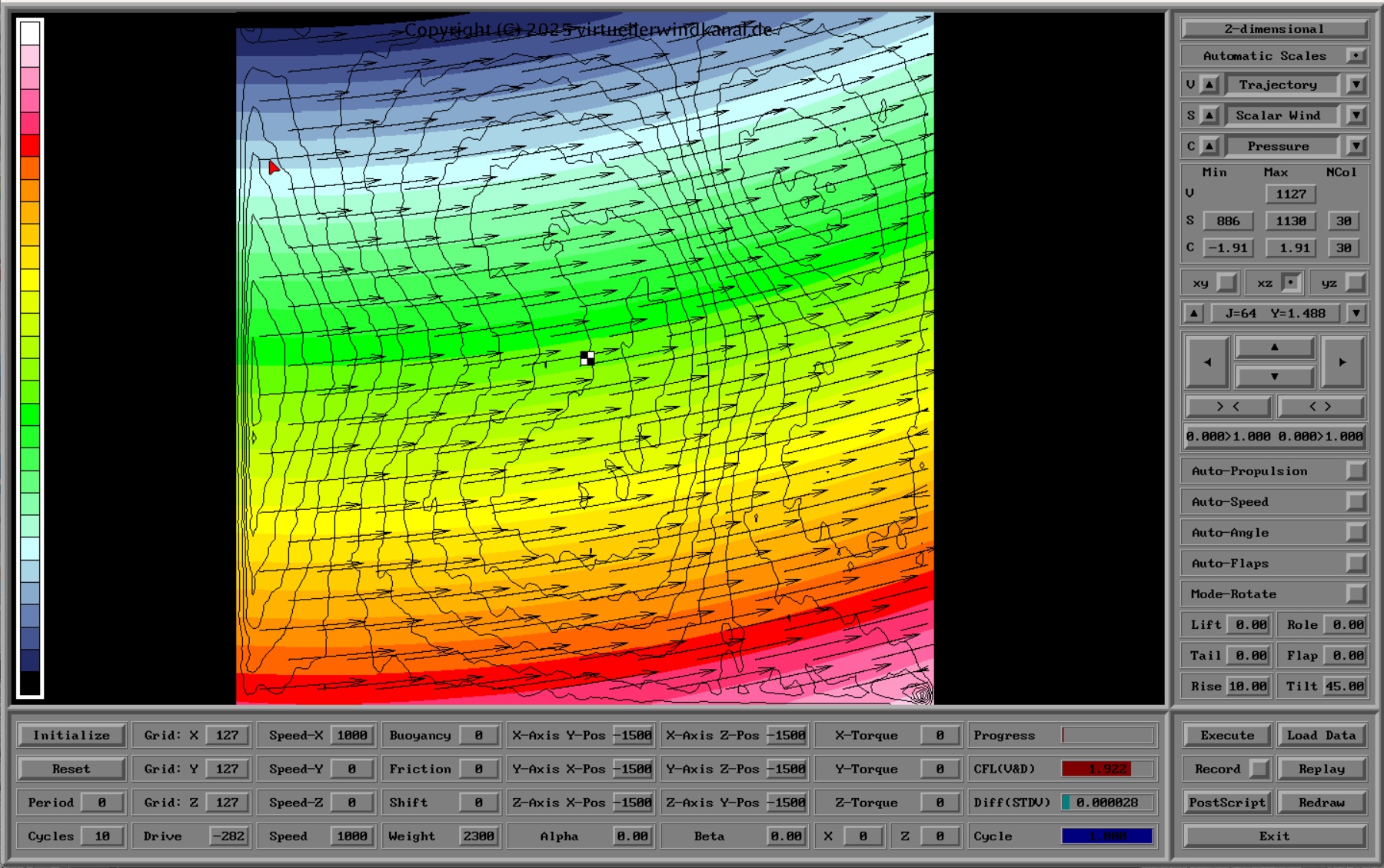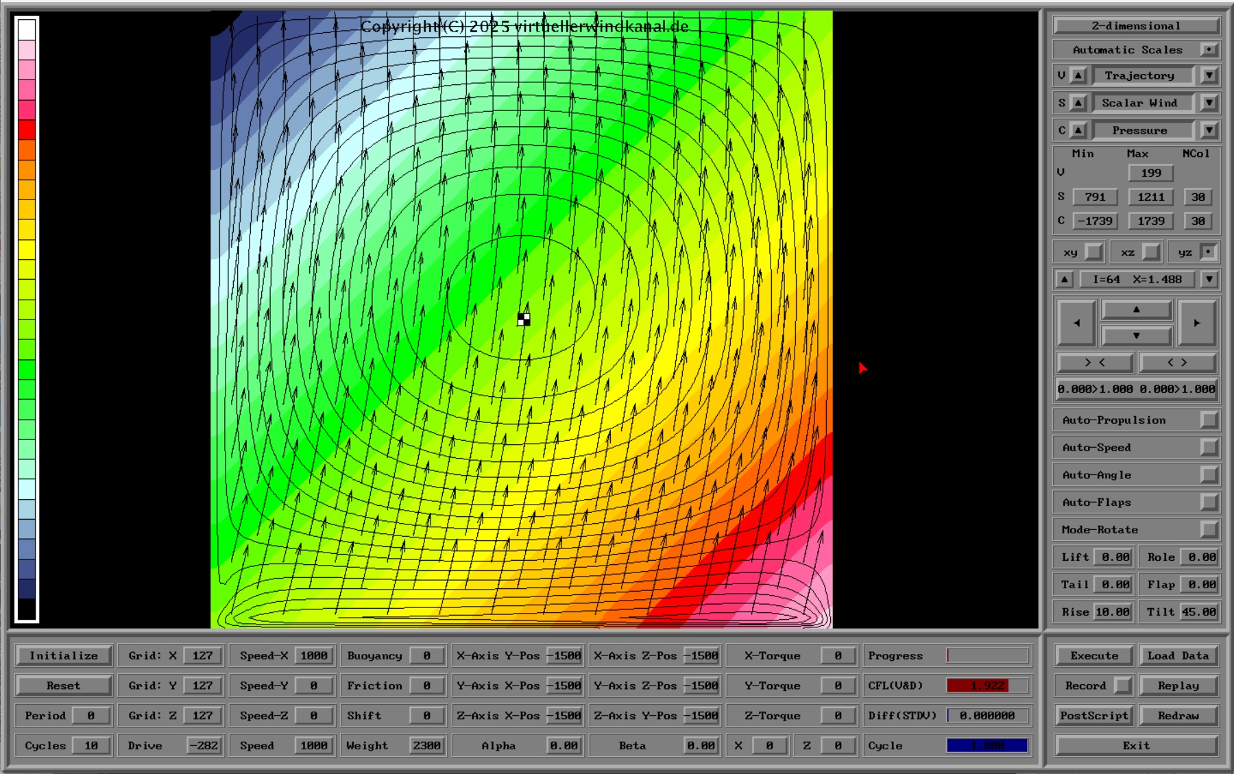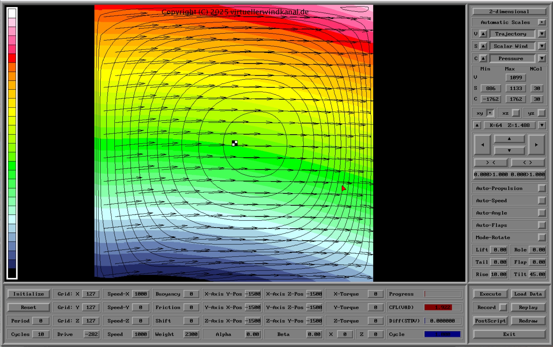Dann wird das 3-dimensionale Geschwindigkeitsfeld für eine Referenzgeschwindigkeit von 10 m/s, einem Anstellwinkel von 10°, einem Neigungswinkel von 45° und einem Kurvenradius von 10m initialisiert und mit einer anfänglich verschwindenden Druckanomalie relativ zur hydrostatischen Grundgleichung das Modell gestartet.