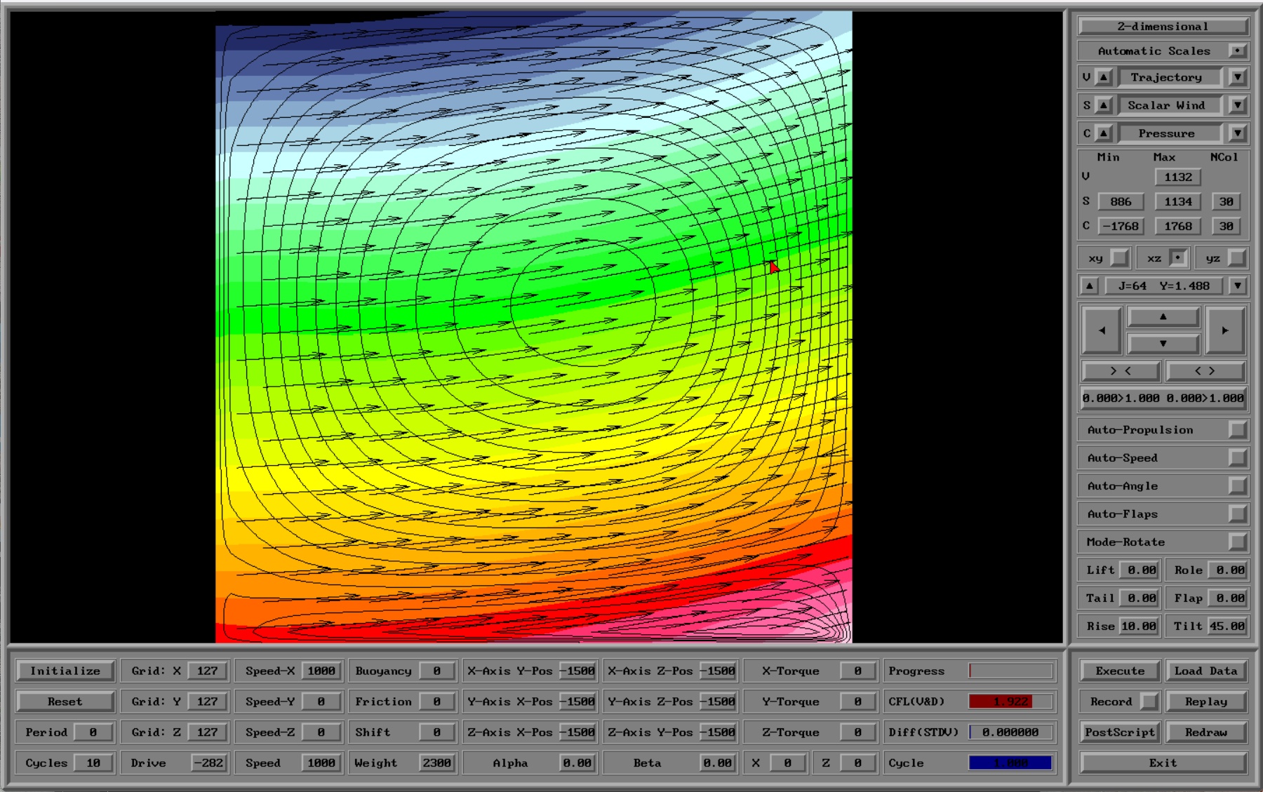Dass das Experiment mit Corioliskraft doch nicht ganz verschwindende Druckanomalieen liefert, interpretiere ich wie folgt: Die Initialisierung des Geschwindigkeitsfeldes ist eine lokale Operation, in die keine Gradienten und damit keine Diskretisierungfehler eingehen. Gleiches gilt formal für die Corioliskraft allerdings mit der Anmerkung, dass jede Geschwindigkeitskomponente auf den Ort einer anderen Komponente gemittelt werden muss und somit doch ein nicht vermeidbarer Diskretisierungsfehler entsteht. Die Impulserhaltung, die als Divergenz des Impulsstroms formuliert ist, enthält Gradienten und entwickelt deshalb Diskretisierungsfehler, die von der Auflösung und Methode abhängig sind. D.h., man hat mit dieser Testsituation die Möglichkeit, die Qualität des Verfahrens für den Impulstransport zu testen. Leider ist es mir nicht vollständig gelungen, mit zunehmender Auflösung die Druckanomalieen auszunullen. Grundsätzlich deuten aber die Ergebnisse an, dass keine gravierenden Umsetzungsfehler für den Kurvenflug vorliegen.