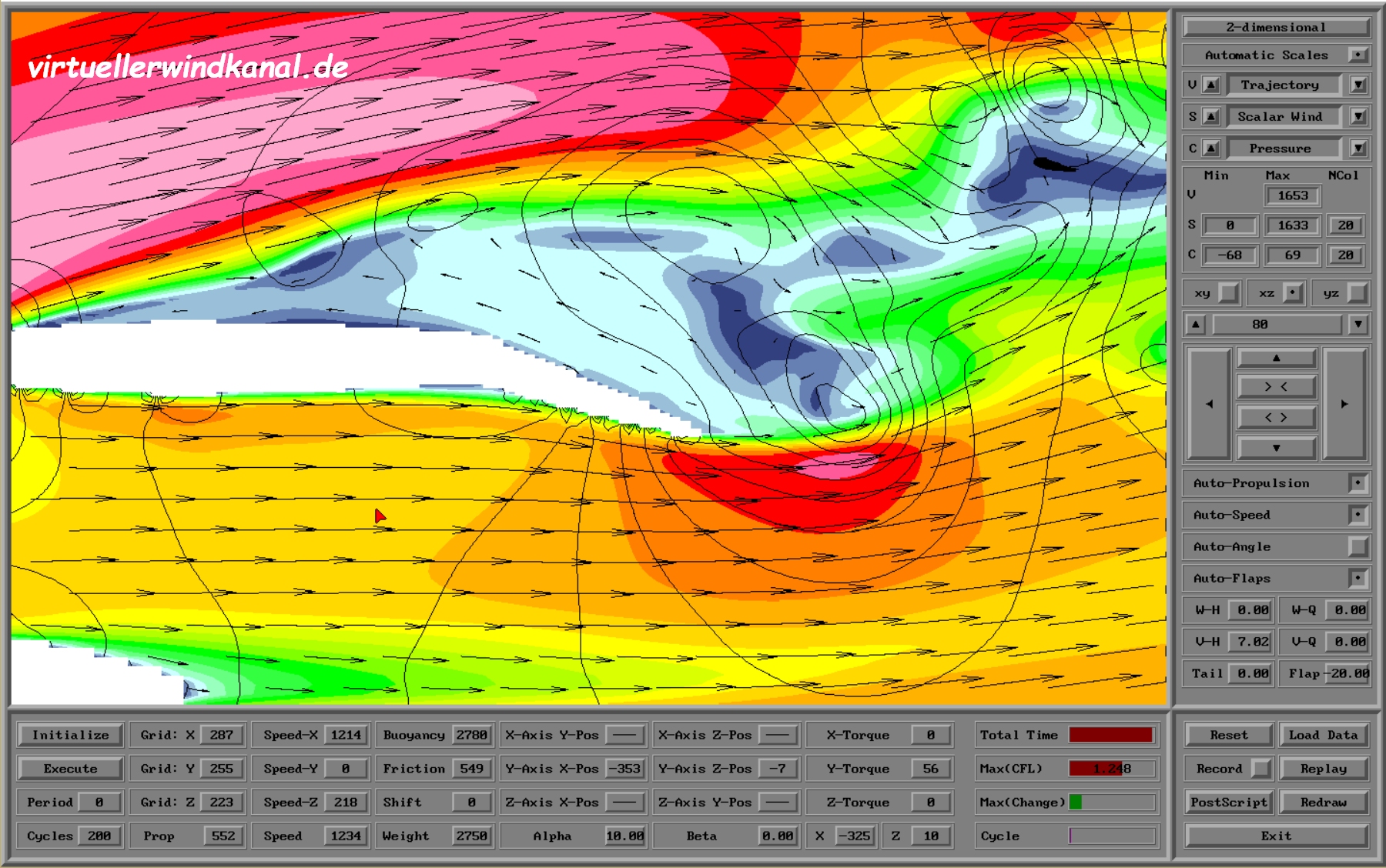 Die Konsequenz ist, dass kleine Wirbel schneller dissipiert werden und größere Wirbel sich langsamer vergrößern. Die Auswirkung ist, dass die horizontalen und vertikalen Diffusionskoeffizienten Ah und Av sich deutlich verkleinern und somit die mittlere Strömung weniger beeinflussen. Konsequenz ist, dass über und hinter der Tragfläche sich wie erwartet ein Wirbelfeld aufbaut. Ein Schnappschuß verdeutlicht dies mit Bild KatExtraUVPxz2. Positives Ergebnis ist, dass der erforderliche Höhenruderausschlag in diesem Beispiel jetzt nur bei 7,02 Grad liegt, aber dieser Wert schwankt mit dem Eintreffen neuer Wirbel am Höhenleitwerk. Diese sorgen für einen ständigen Wechsel in der Anströmung und folglich im Auftrieb und in letzter Konsequenz auch beim Drehmoment um die Querachse. Ein stabiler, stationärer Zustand, auf den meine Suchalgorithmen basieren, ist dann nicht erreichbar. Nachdem ich jetzt den "status quo" meines virtuellen Windkanals kenne, könnte man meinen, dass etwas Feinabstimmung an der Turbulenzschliessung alles perfekt macht. Aber es gibt auch Fundamentalkritiken an Turbulenzschliessungen: Nicht ohne Grund verwenden Meteorologen für globale Wetter- und Klimavorhersagemodelle nicht nur eine sondern Schwärme von Kugelflächenfunktionen, um nichtlinreare Wechselwirkung präzise zu berechnen. Dies fehlt in Turbulenzschliessungen. Kollidieren 2 Wirbel unterschliedlicher Größe, so ergibt eine mathematische Formelsammlung z.B. für ...(x) * ...(y) = ...(x+y) + ...(x-y) (... steht für sinus oder cosinus). Übersetzt heißt dies, dass 2 neue Wirbel enstehen mit der Größe x+y und x-y. Die Eigenschaft eines Flugzeugs ist jetzt, dass es keine Punktquelle von Turbulenz ist, sondern entlang von Flächen bereits entstandene und damit gealterte mit frisch erzeugter Turbulenz kollidiert und am Schluss ein Spektrum von Wirbeln unterschiedlicher Größe koexistiert. Und weil dies schwer in mathematische Formeln zu kleiden ist, muss man sich bewusst sein, dass eine Turbulenzschliessung nie allgemeingültig sein wird. Würde ich es jetzt schaffen, einen Satz von Parametern zu finden, bei dem z.B. alle Ruderausschläge perfekt simuliert würden, so wäre dieser Parametersatz nur gültig für eine Katana S 50E V.2. Das hilft aber auch nicht wirklich weiter.