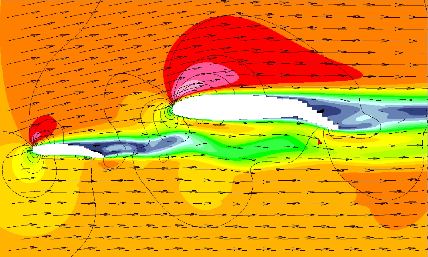 Es gilt das Prinzip: Landungen erfolgen immer unter widrigen Umständen, wie z.B. Seitenwind. Deshalb wird das folgende Experiment so angesetzt, dass bei einem Querwind von 5 Grad von links die Geschwindigkeit gesucht wird, bei der mit ausgefahrenen Landeklappen mit einem Ausschlag von 30 Grad und einem Anstellwinkel von 10 Grad alle Ruderausschläge so bestimmt werden, dass alle Drehmomente verschwinden und der Auftrieb das Gewicht der Flug-Ente egalisiert.Um einen Eindruck zu erhalten, was man aufgrund der perfekten Transparenz von Luft nie zu sehen bekommt oder eventuell nur dann, wenn man im einem realen Windkanal mit Rauchfahnen arbeitet, zuerst ein Schnitt in der xz-Ebene in einem gewissen Abstand zum Rumpf, uzw. um die Strömungen um die ausgefahrene Landeklappe und zugleich um das Ruder am Vorflügel zu veranschaulichen. Bild H11V5GLTKL zeigt die Strömungsgeschwindigkeit in Farbe und deren Trajektorien sowie quasi die Wirbelgröße der Turbulenz als Konturen. Es ist sofort ersichtlich, dass sich bei 10 Grad Anstellwinkel hinter den ausgefahrenen Lande- und Vorflügelklappen sich Wirbel bilden, die stromabwärts sich als Wellen fortpflanzen. Erfahrungsgemäß beginnt bei 10 Grad Anstellwinkel für das gewählte, nicht laminare Profil sich die Strömung abzulösen. Der Auftrieb kann auch durch Erhöhung des Anstellwinkels nicht mehr wesentlich vergrößert werden. In einem weiteren Bild H11V5GLTKV für den identischen Schnitt wird wie vorher als Konturen jetzt die vertikale, turbulente Energie gezeigt. Daraus ergibt sich im Bild H11V5GLTKLAV ein vertikaler Diffusionskoeffizient als Kontur zusammen mit der Wirbelgröße in Farbe. Diffusionskoeffizienten sind dann die Auslöser für die Bildung einer Grenzschicht und damit relevant für Auftrieb und Luftwiderstand.