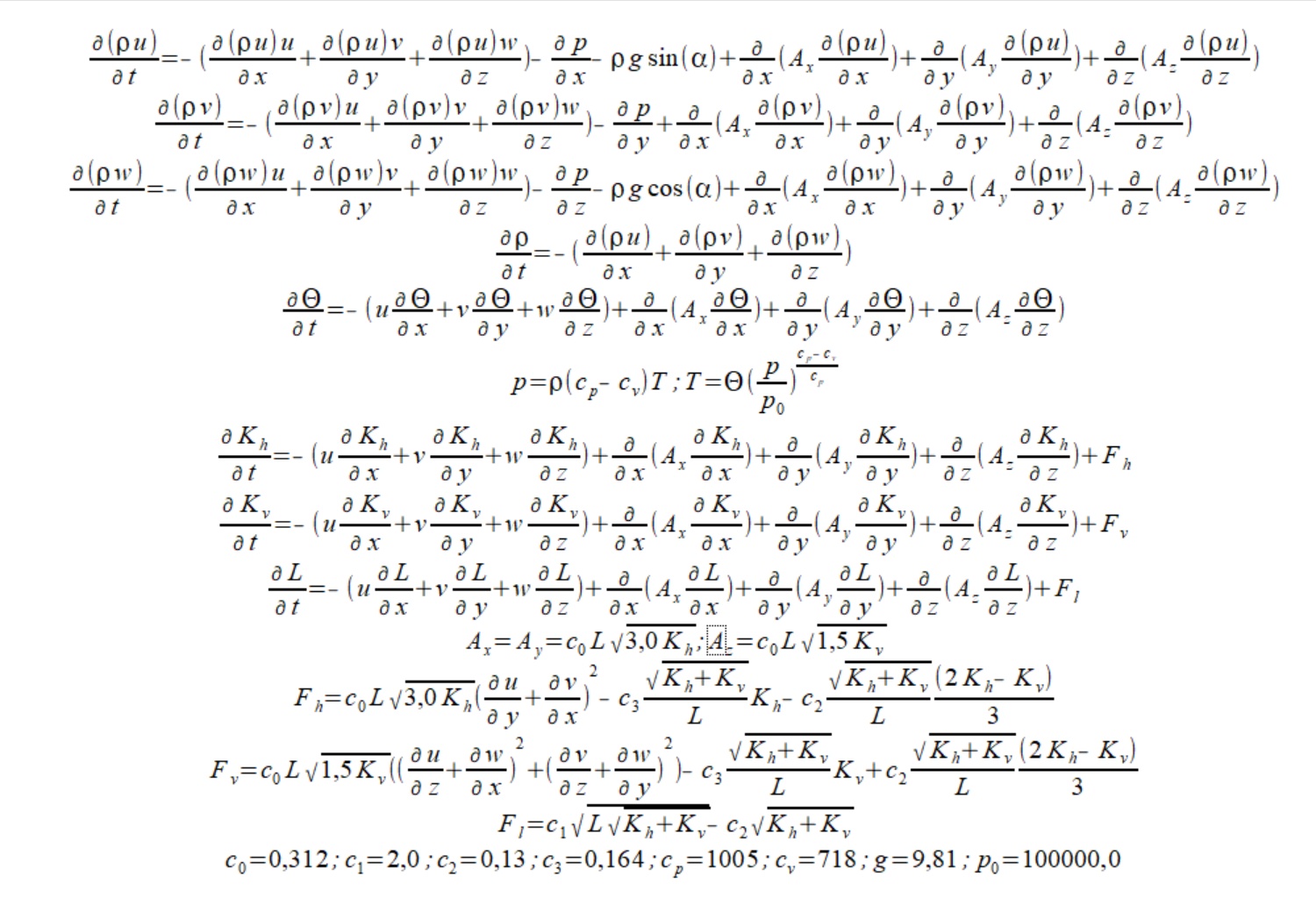 Die Bewegungsgleichungen für die mittlere Strömung werden durch 3 prognostische Gleichungen für den Impuls (Dichte mal Geschwindigkeit), der Dichte über eine sog. Kontinuitätsgleichung, der potentiellen Temperatur, einer diagnostischen Gleichung genannt Zustandsgleichung, die die Beziehung zwischen Druck, Temperatur und Dichte herstellt und einer Gleichung, mit der man potentielle Temperatur in in situ Temperatur umrechnen kann, numerisch gelöst. Komplettiert werden die 3 Gleichungen für den Impuls neben den Termen für Impulstransport, Druckgradienten und Schwerkraft mit einer Impulsdiffusion, die je nach Richtung mit räumlich variablen Diffusionskoeffizienten in der Lage sind, die Auswirkungen der Turbulenz abzubilden. Turbulenz ist die Voraussetzung für die Bildung einer Grenzschicht, d.h. eines Geschwindigkeitsprofils an einer festen Oberfläche, und davon bietet ein Flugzeug genug.