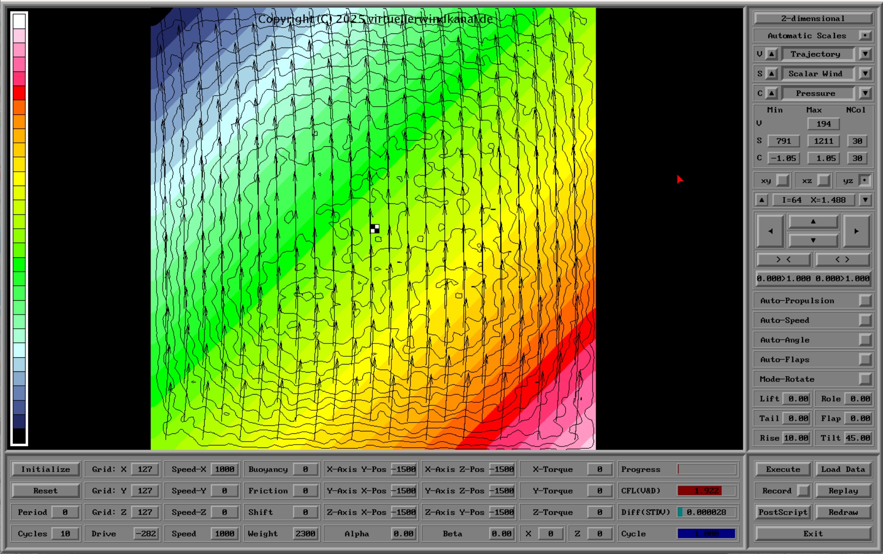 Dann wird das 3-dimensionale Geschwindigkeitsfeld für eine Referenzgeschwindigkeit von 10 m/s, einem Anstellwinkel von 10°, einem Neigungswinkel von 45° und einem Kurvenradius von 10m initialisiert und mit einer anfänglich verschwindenden Druckanomalie relativ zur hydrostatischen Grundgleichung das Modell gestartet.